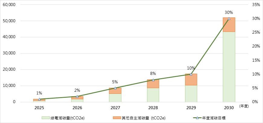 氣候變遷已是全球須共同面對的議題,對於台光電子而言,在產量持續增加的情況下,更應致力於精進減碳相關作為。本公司配合持續增長的產能、合理的減碳規劃、PCB業界趨勢,以及地區與國際規範等因子,已設定以2023年為基準年,於2030年達成減碳30%,2050年依政府及國際規範達成淨零碳排。同前述減碳目標,同步設定以2023年為基準年,於2030年時綠電減碳應達25%。由此推估,屆時綠電使用約當47%。惟因擴廠及產能提升計畫持續推進中,故現階段減碳目標之設定暫不含新設產線及美國和馬來西亞廠區。