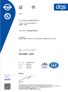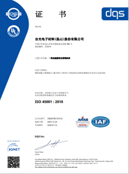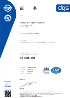 台光电子重视职业安全卫生管理绩效,致力于员工、客户、社区及相关营运伙伴等利害关系人安全、舒适、低环境负荷且具效益的营运服务。秉持着「提升作业环境安全卫生,保障工作者减少职业性伤害」的理念,台光电子提升全面性建设,逐年改善员工作业环境,员工便能专心投入职场。相关管理要求乃依据国际标准及台湾地区劳动部公告之相关法令,建立职业安全卫生管理系统(ISO 45001:2018)。在标准化作业流程要求下我们要求每个生产环节对于安全必须严格遵守,务必建立员工安全意识,不怠忽职场安全,职灾发生原因厘清并彻底分析,以利后续研讨预防对策及处理。