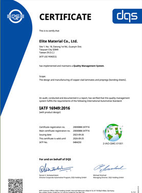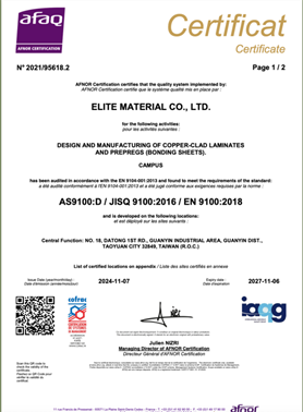 台光电子作为全球铜箔基板的领导者,台光电始终致力于提供卓越的产品品质,并将其视为企业运营的愿景之一。台光电严格遵循国际品质管理标准,且品质管理系统已获得ISO 9001、IATF 16949、AS 9100、QC 080000验证,并不断透过内部监控与改善机制以持续改善品质管理系统。