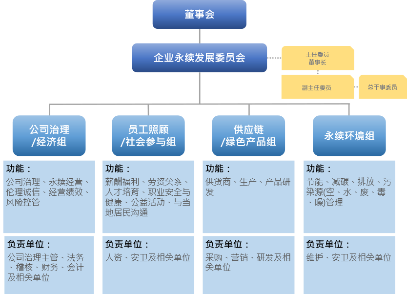 台光电子为善尽企业社会责任,落实永续经营理念,董事会通过「企业社会责任实务守则」,2024年10月经董事会通过将「企业永续发展委员会」提升为直属董事会的功能性委员会,并同步制订「企业永续发展委员会组织规程」,规范企业永续发展委员会之设置目的、委员组成、职权等相关事项。 「企业永续发展委员会」由董事长担任主任委员,下辖公司治理/经济组、供应链/绿色产品组、员工照顾/社会参与组、永续环境组等小组,由相关单位部门主管或其派代表所组成。负责各议题资料搜集、规划、评估及执行。本报告书相关资讯由各部门进行收集并由部门主管覆核后,送交企业永续发展委员会进行资讯汇整、编制及内部稽核工作,完成之报告书经送董事会核定后发布。
